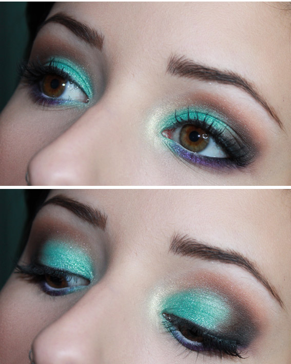 Essa parte é opcional e quem quer arriscar o exagerar na cor pode pular e deixar a parte de baixo dos olhos só com o marronzinho. Eu apliquei a sombra roxa opaca rente aos cílios inferiores, e usei o pigmento Violet da MAC pra conectar o roxo escuro com o verde clarinho.